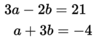 Getting to the Answer:The question provides a system of two linear equations with two variables. Since the coefficient of a in the second equation is 1, substitution is a good way to solve for b. Subtract 3b from both sides of a + 3b = -4 to get a = -4 - 3b. Plug this value into the first equation to get 3(-4 - 3b) - 2b = 21. Distribute the 3 to yield -12 - 9b - 2b = 21. Combine like terms to obtain -11b = 33. Divide by -11 to see that b = -3.